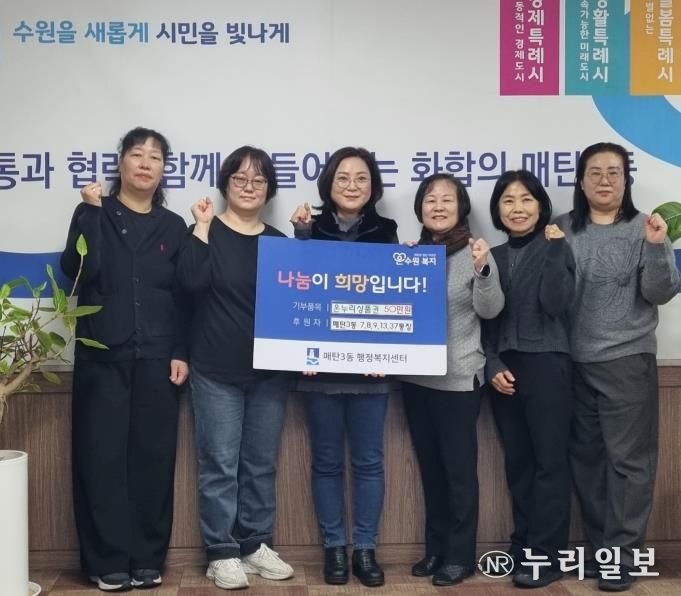 (누리일보) 수원시 영통구 매탄3동은 지난 3일 매탄3동 7, 8, 9, 13, 37통장 일동이 설 명절을 맞아 관내 어려운 이웃들에게 온누리상품권 50만원을 기부했다고 밝혔다.