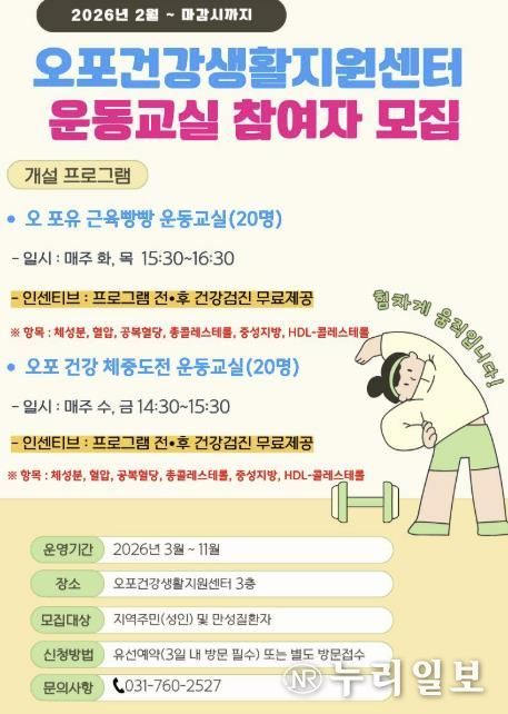 (누리일보) 광주시보건소는 지역 주민의 규칙적인 신체 활동을 장려하고 만성질환을 예방하기 위해 ‘2026년 맞춤형 운동 교실’ 참여자를 모집한다고 4일 밝혔다.