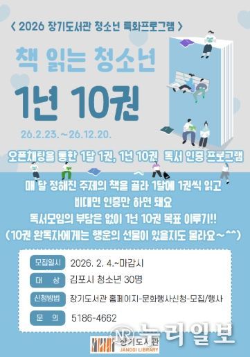(누리일보) 김포시 장기도서관은 청소년의 자발적인 독서 습관 형성을 위해 청소년 특화프로그램 ‘책 읽는 청소년 1년 10권’을 오는 2월 23일부터 연말까지 운영한다.
