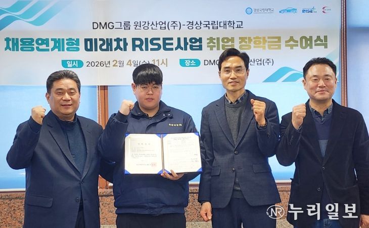 (누리일보) 경상국립대학교는 2월 4일 오전 11시 함안군에 소재한 원강산업(주) 회의실에서 ‘채용연계형 미래차 RISE사업 취업 장학금 수여식’을 개최했다.