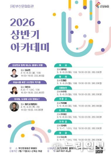 (누리일보) (재)부산문화회관은 오는 3월 9일부터 7월 1일까지 2026년도 상반기 정규 아카데미 강좌를 개설한다.