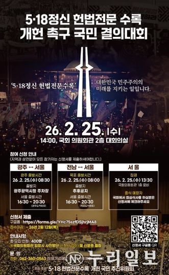 (누리일보) 5·18정신을 헌법전문에 수록하기 위한 개헌을 촉구하는 각계의 목소리가 높아지고 있다. 오는 6월 전국 동시 지방선거와 연계한 ‘원포인트 개헌’ 논의가 확산되면서 5·18정신 헌법전문 수록을 요구하는 사회적 공감대도 빠르게 확산하고 있다.