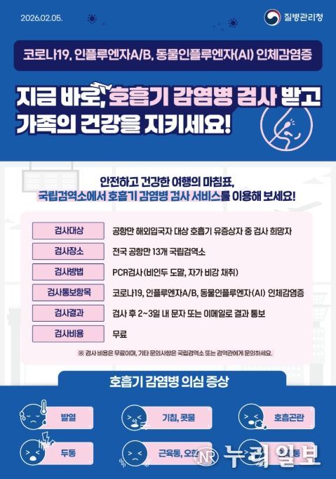 (누리일보) 질병관리청은 2026년 2월 10일부터 '여행자 호흡기 감염병 검사 서비스'를 전국 공항·항만 13개 검역소(12개 지소)로 확대하여 시행한다.