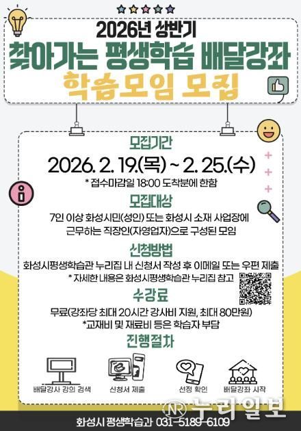 (누리일보) 화성특례시는 2월 19일부터 2월 25일까지 2026년 상반기'찾아가는 평생학습 배달강좌'학습모임을 모집한다.