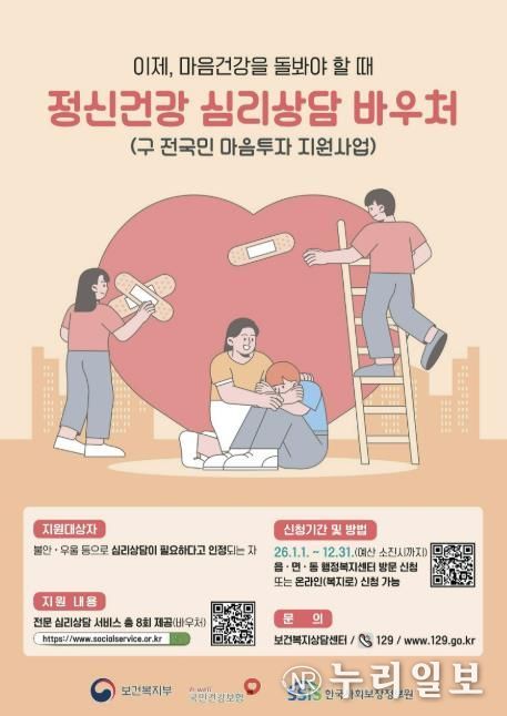 (누리일보) 성남시는 우울, 불안, 스트레스 등으로 정서적 어려움을 겪는 시민을 위해 ‘정신건강 심리상담 바우처 사업(옛 전국민 마음투자 지원사업)’을 시행한다고 9일 밝혔다.