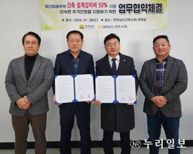 (누리일보) 전라남도는 태풍·집중호우 등 자연재난으로 주택 전파·반파 피해를 입은 도민의 신속한 주거 안정을 위해 대한건축사협회 전남도건축사회와 설계·감리비를 50% 감면하는 업무협약을 했다고 밝혔다.