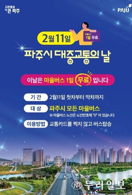 (누리일보) 파주시는 ‘대중교통의 날’을 맞아 대중교통 이용 활성화와 시민 교통비 부담 완화를 위해 오는 2월 11일 하루 동안 파주시 전 지역의 모든 마을버스를 무료로 운행한다.