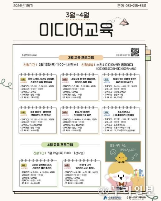 (누리일보) 수원문화재단 수원시미디어센터는 다가오는 봄, 시민들의 미디어 제작 역량을 깨우기 위한 2026년 3~4월 미디어 교육을 개설하고 수강생 모집에 나선다.