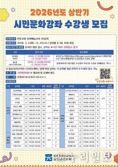 (누리일보) 광주시교육청금호평생교육관은 오는 3~6월 ‘2026년 상반기 시민문화강좌’를 운영한다.