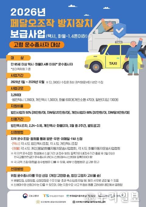 이번 사업은 만 65세 이상 택시 및 화물차량(최대적재량 1.4톤 이하) 운수종사자 대상으로 추진하며, 1차 공고는 법인택시를 대상으로 2월 24일부터 3월 9일까지 각 시도 법인택시조합을 통해 접수한다.