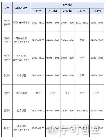 권역응급의료센터 등 주요 응급의료기관의 과부하를 줄이고 경증 환자의 외래 진료 공백을 최소화하기 위해, 연휴 기간 하루 평균 의료기관 459개소와 약국 240개소가 운영된다. 특히 소아 응급환자 진료 공백을 최소화하기 위해 예수병원 소아전문응급의료센터는 24시간 운영되며, 달빛어린이병원과 원광대학교병원 권역응급의료센터 소아진료실도 정상 운영된다.