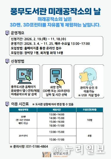 (누리일보) 김포시 풍무도서관은 특화공간인 미래공작소를 개방하는 ‘미래공작소의 날’을 오는 3월 4일부터 11월 25일까지 매주 수요일 오후 1시부터 5시까지 운영한다.
