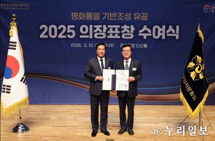 (누리일보) 이상복 오산시의회 의장이 10일 경기도청 다산홀에서 ‘2025년 평화통일 기반 조성 유공 표창’을 받았다.