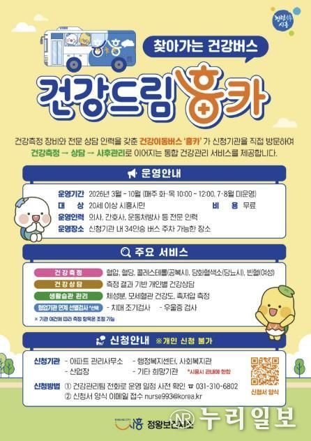 (누리일보) 시흥시는 시민의 건강 증진과 일상 속 건강관리 실천을 지원하기 위해 찾아가는 건강버스 ‘건강드림 흥카’를 3월부터 10월까지 무료로 운영한다.