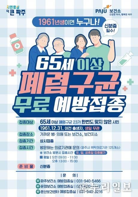 (누리일보) 파주시는 고령층의 건강한 노후와 감염병 예방을 위해 65세 이상 시민을 대상으로 폐렴구균 예방접종을 연중 무료로 지원하고 있다고 밝혔다.