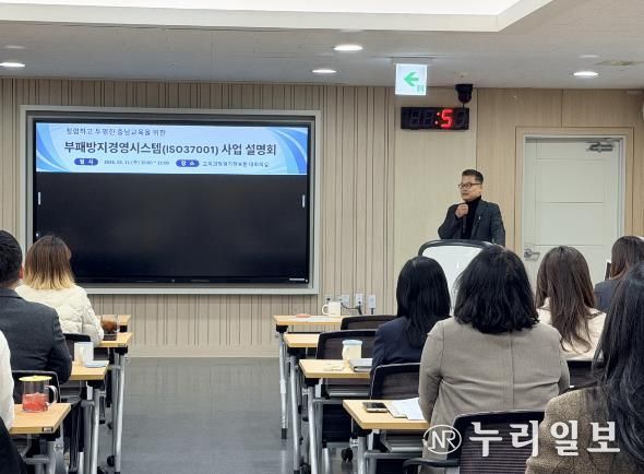 이를 위해 11일, 충청남도교육청교육과정평가정보원(홍성)에서 부패방지경영시스템(ISO 37001) 운영 내재화·지속적 개선을 위한 사업설명회를 개최하고, 사후 인증심사 대응 방향과 부패 위험성 개선 방안, 부서별 역할과 협조 사항을 공유했다.