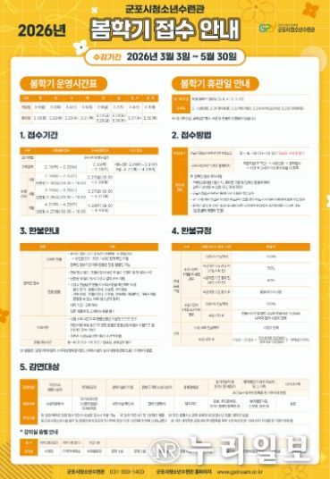 (누리일보) (재)군포시청소년재단 군포시청소년수련관은 오는 2026년 3월 3일부터 5월 30일까지 ‘2026년 봄학기 문화체육 프로그램’을 운영하며, 2월 26일부터 신규 수강생 접수를 시작한다.