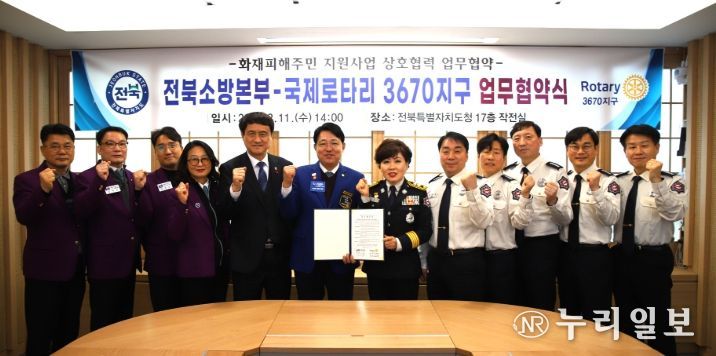 (누리일보) 전북특별자치도소방본부는 11일 국제로타리 3670지구(총재 김성희)와 화재피해주민 지원사업의 원활한 추진을 위한 상호협력 업무협약을 체결했다고 밝혔다.