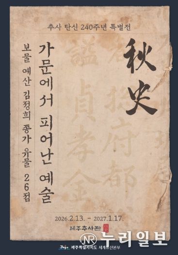 (누리일보) 제주특별자치도 세계유산본부가 추사 김정희(1786~1856) 탄신 240주년을 기념해 예산 김정희 종가에서 전래된 보물급 유물들을 한자리에서 선보인다.