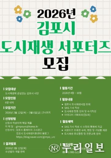 (누리일보) 김포시는 다양한 도시재생사업을 홍보하고 도시재생에 대한 시민들의 이해와 관심을 도모하고자 오는 12일부터 ‘2026년 김포시 도시재생 서포터즈’를 모집한다.