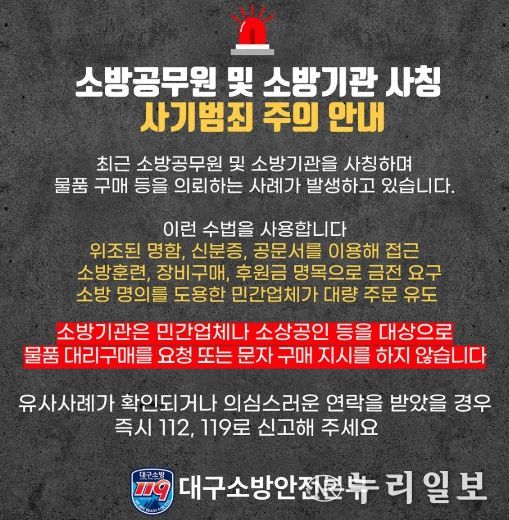 (누리일보) 대구소방안전본부는 최근 소방공무원과 소방기관을 사칭해 물품 구매나 계약 체결을 유도하는 사기 범죄가 잇따르고 있다며 시민과 업체에 각별한 주의를 당부했다.