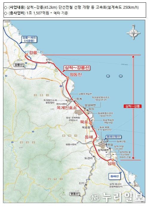 (누리일보) 국토교통부는 2월 12일 동해선 삼척-강릉 철도 고속화 사업과 부산도시철도 정관선 건설사업이 사업 타당성을 확보하여 예비타당성조사를 통과했다고 밝혔다.