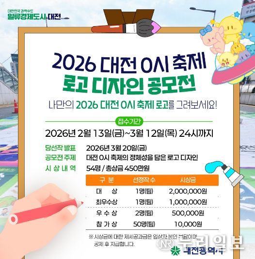 (누리일보) 대전시는 올해 대중과의 소통을 강화하고 시민과 함께 만들어가는 축제를 구현하기 위해 ‘2026 대전 0시 축제 로고(EI) 디자인 공모전’과 ‘대전 상징 티셔츠 디자인 공모전’을 개최한다.