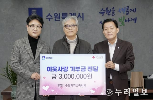 이웃돕기성금 300만 원은 수원지역건축사회 회원 137명이 모금해 마련했다. 수원지역건축사회는 2024년에도 이웃돕기성금 300만 원을 기부한 바 있다.
