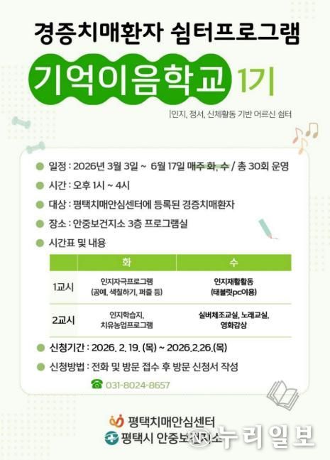 (누리일보) 평택시 안중보건지소는 경증 치매 환자의 인지기능 유지와 일상생활 지원을 위해 오는 3월 3일부터 6월 17일까지 경증 치매 환자 쉼터 프로그램 ‘기억이음학교 1기’를 운영한다.
