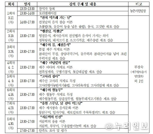 교육은 3월 12일부터 4월 30일까지 매주 1회, 총 8회에 걸쳐 진행된다. 강사는 제주향토음식명인(3호) 부정숙 제주음식문화원 원장이 맡는다. 80% 이상 출석하면 수료증을 받을 수 있다.