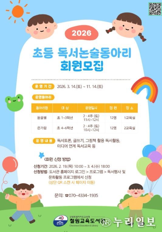 (누리일보) 철원교육도서관 2026년 초등 독서논술동아리를 3월 14일부터 11월 14일까지 운영하며, 이를 위해 2월 19일부터 동아리 회원을 모집한다.