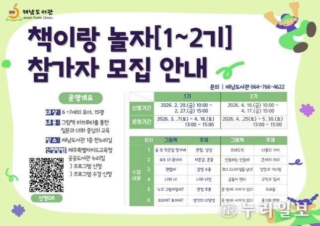 (누리일보) 제주도교육청 제남도서관은 3월부터 서귀포 관내 6~7세 아동을 대상으로 전문적인 독서 교육과 돌봄을 결합한 ‘책이랑 놀자’ 프로그램 운영을 시작하며 참가자를 모집한다.