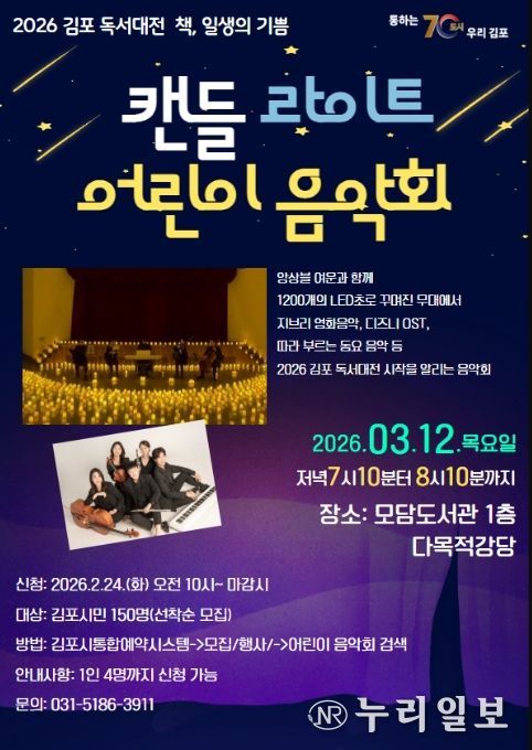 (누리일보) 김포시 도서관은 2026 김포 독서대전의 시작을 알리는 공연으로 '캔들 라이트 어린이 음악회'를 2026년 3월 12일 19시 10분부터 20시 10분까지 모담도서관 1층 다목적강당에서 진행한다.