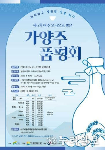 (누리일보) 여주세종문화관광재단(이사장 이순열)이 오는 3월 3일부터 3월 20일까지 ‘제6회 여주 오곡으로 빚은 가양주 품평회’ 참가자를 모집한다.