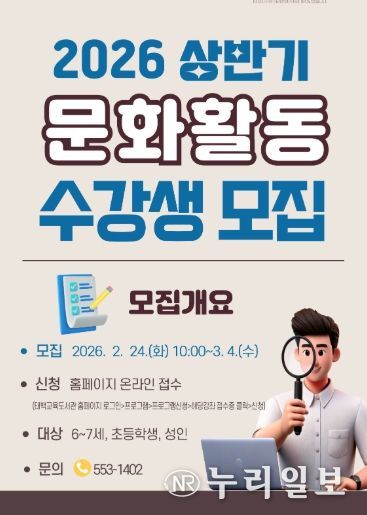 (누리일보) 태백교육도서관은 3월 18일부터 7월 8일까지 지역 내 유아·초등학생·성인을 대상으로 ‘2026년 상반기 문화활동강좌’를 운영한다.