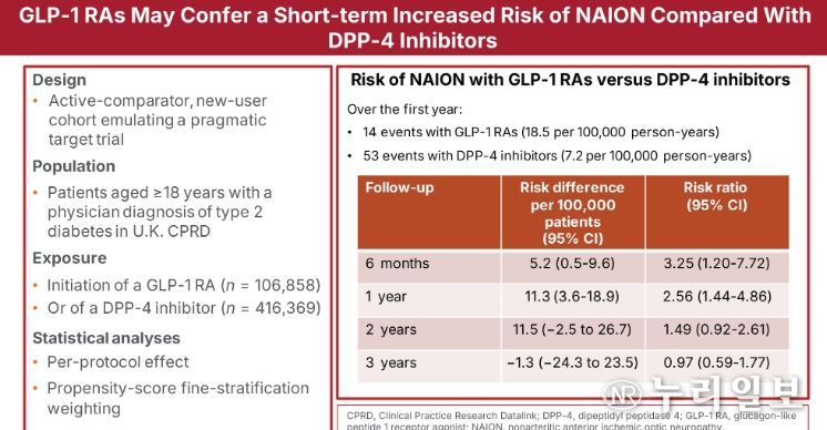 그 결과, 치료 시작 후 1년 이내 NAION 발생 위험은 GLP-1 치료제 사용군에서 비교군 대비 약 2.6배 높았다(위험비 2.56, 95% 신뢰구간 1.44-4.86).