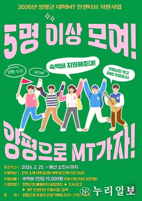 (누리일보) 양평군은 25일부터 관외 대학생들의 지역 방문을 유도하고 관광 활성화를 도모하기 위해 ‘2026년 양평군 대학 엠티(MT) 인센티브 지원 사업’을 본격 시행한다고 밝혔다.