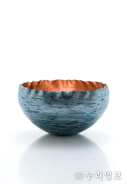 'Blue Wave No.5'는 한국 전통 자개 공예의 ‘끊음질’ 기법을 현대적으로 확장한 작품으로, 금속 기형 위에 자개를 한 조각씩 붙여 밀도 높은 표면을 구축한 것이 특징이다.