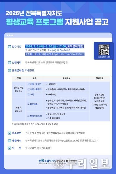 (누리일보) 전북특별자치도평생교육장학진흥원(원장 이현웅)은 도민의 지속적인 성장과 삶의 질 향상을 위해 '2026년 전북특별자치도 평생교육 프로그램 지원사업'공모를 실시하고, 참여할 도내 평생교육 기관·단체를 모집한다.