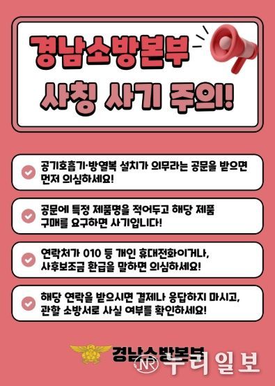 (누리일보) 경상남도 소방본부는 최근 도내 종교시설과 보육시설 등을 대상으로 소방본부를 사칭해 ‘소방용 공기호흡기 및 방열복 설치’를 강요하는 허위 공문이 유포되고 있다며 4일 각별한 주의를 당부했다.