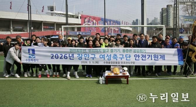 (누리일보) 수원시 장안구 여성축구단은 지난 5일, 수원종합운동장 인조잔디구장에서 선수단과 관계자 등 30여 명이 참석한 가운데 2026년 안전기원제를 진행했다.
