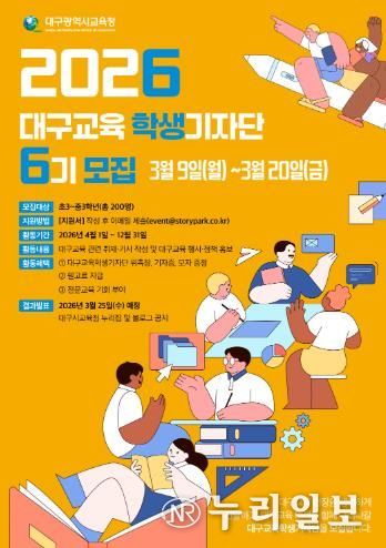(누리일보) 대구시교육청은 3월 9일부터 20일까지 2주간 대구교육의 주요 정책과 각종 소식을 생동감 있게 전하는 대구교육의 홍보대사 역할을 할‘2026년 대구교육기자단’을 모집한다고 밝혔다.