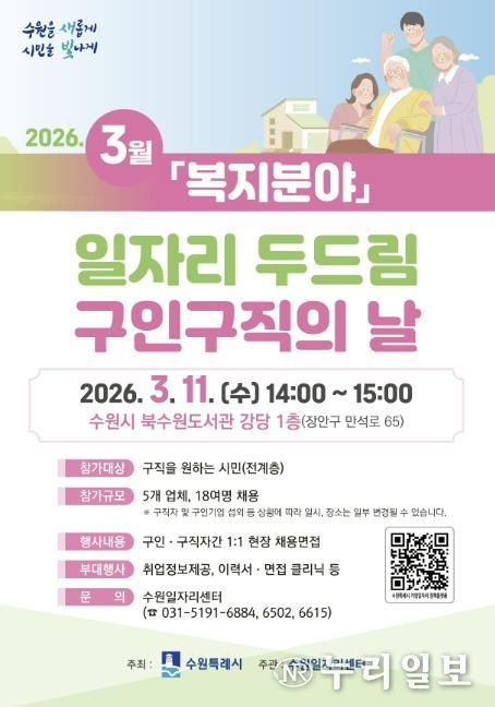 (누리일보) 수원특례시는 3월 11일 오후 2시부터 3시까지 북수원도서관 강당에서 ‘3월 일자리 두드림 구인·구직의 날’을 개최한다.