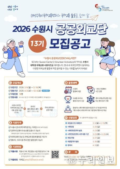 (누리일보) 수원시국제교류센터가 ‘2026 수원시 공공외교단(SCVA) 13기’를 3월 19일까지 모집한다.