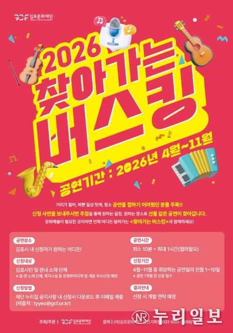 (누리일보) (재)김포문화재단은 시민들의 일상 속 문화예술 향유 기회 확대를 위한 ‘2026 찾아가는 버스킹’ 공연 관람 희망 단체를 모집한다고 밝혔다.