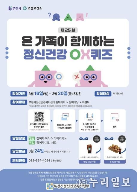 (누리일보) 부천시는 부천시정신건강복지센터와 함께 3월 16일부터 3월 20일까지 ‘제25회 온 가족이 함께하는 정신건강 OX퀴즈’를 진행한다.
