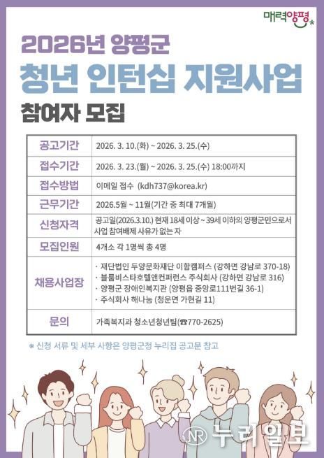 (누리일보) 양평군은 인력이 필요한 관내 사업장과 미취업 청년을 연계하고 사업장에 인건비를 지원하는 ‘2026년 양평군 청년 인턴십 지원 사업’ 참여자를 모집한다고 10일 밝혔다.