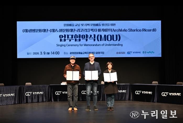 (누리일보) (재)광명문화재단은 3월 9일 오후 2시 광명극장에서 (재)노원문화재단, 리코르디 역사 아카이브(Archivio Storico Ricordi)(이하 리코르디)와 ‘문화예술 교류 및 지역 문화예술 발전’을 위한 업무협약(MOU)을 체결했다고 밝혔다.