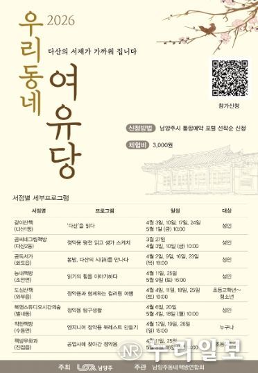 (누리일보) 남양주시는 오는 27일부터 시민이 생활과 밀접한 동네 책방에서 다산 정약용을 접할 수 있도록 ‘우리동네 여유당’ 프로그램을 운영한다고 10일 밝혔다.