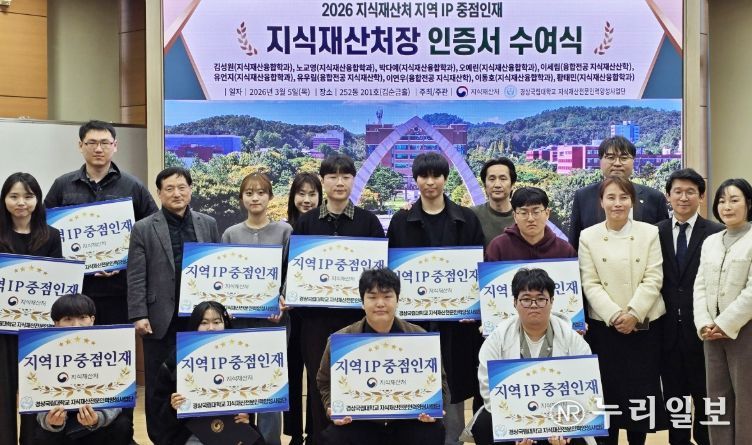 (누리일보) 경상국립대학교지식재산전문인력양성사업단은 3월 5일 법과대학 김순금홀에서 지식재산 실무인재 양성을 위한 ‘지역 IP 중점인재’를 선발하고 인증서를 수여했다.
